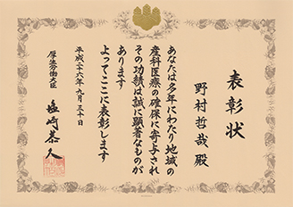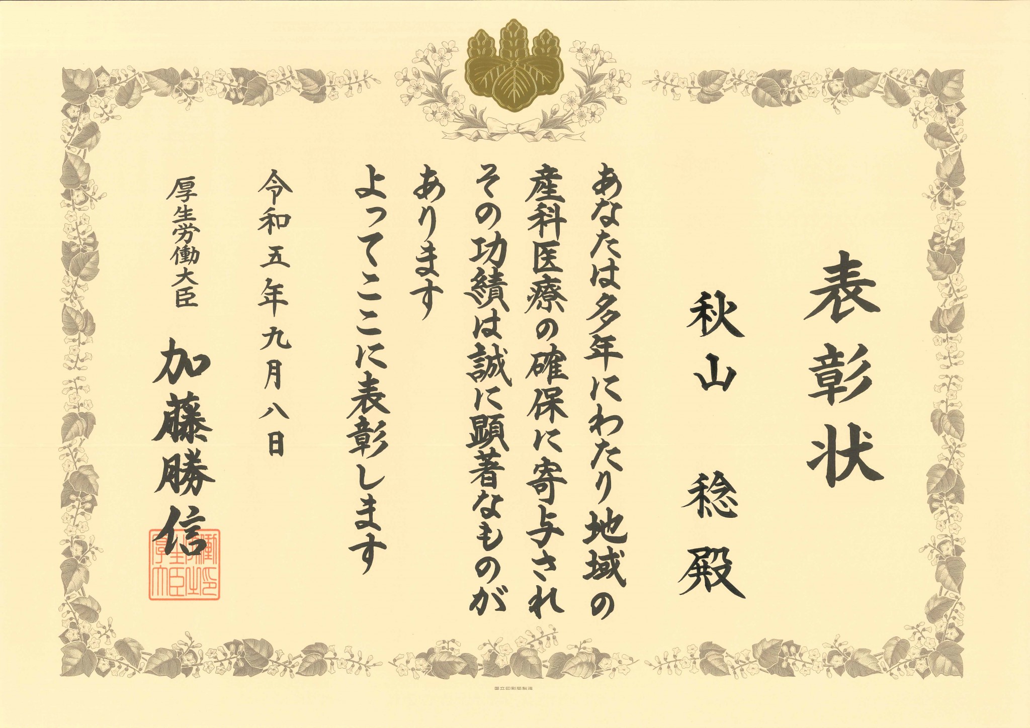 平成26年 多年にわたる産科医療への貢献と功労が認められ、産科医療功労者厚生労働大臣表彰を授与。