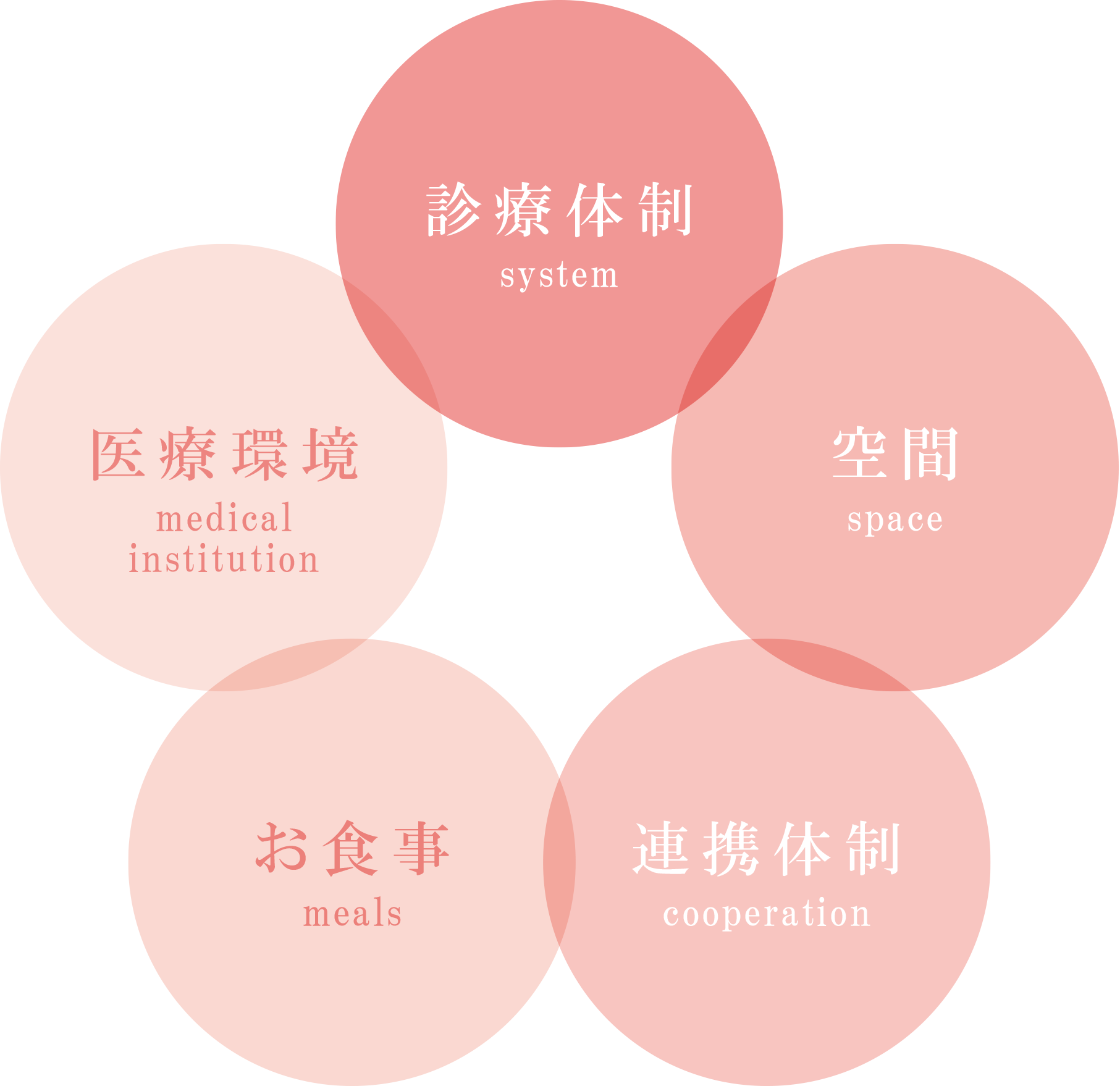 私たちは、新しい生命の誕生という感動的な瞬間に立会い、共に歓喜できることに喜びを感じています。ひとりひとりが満足できる出産を目指し、妊婦さんとその家族の方々に寄り添い、きめ細かな医療・看護・入院環境を提供すべく、スタッフ一同がそれぞれの持ち場で自分の力を発揮するように心がけます。